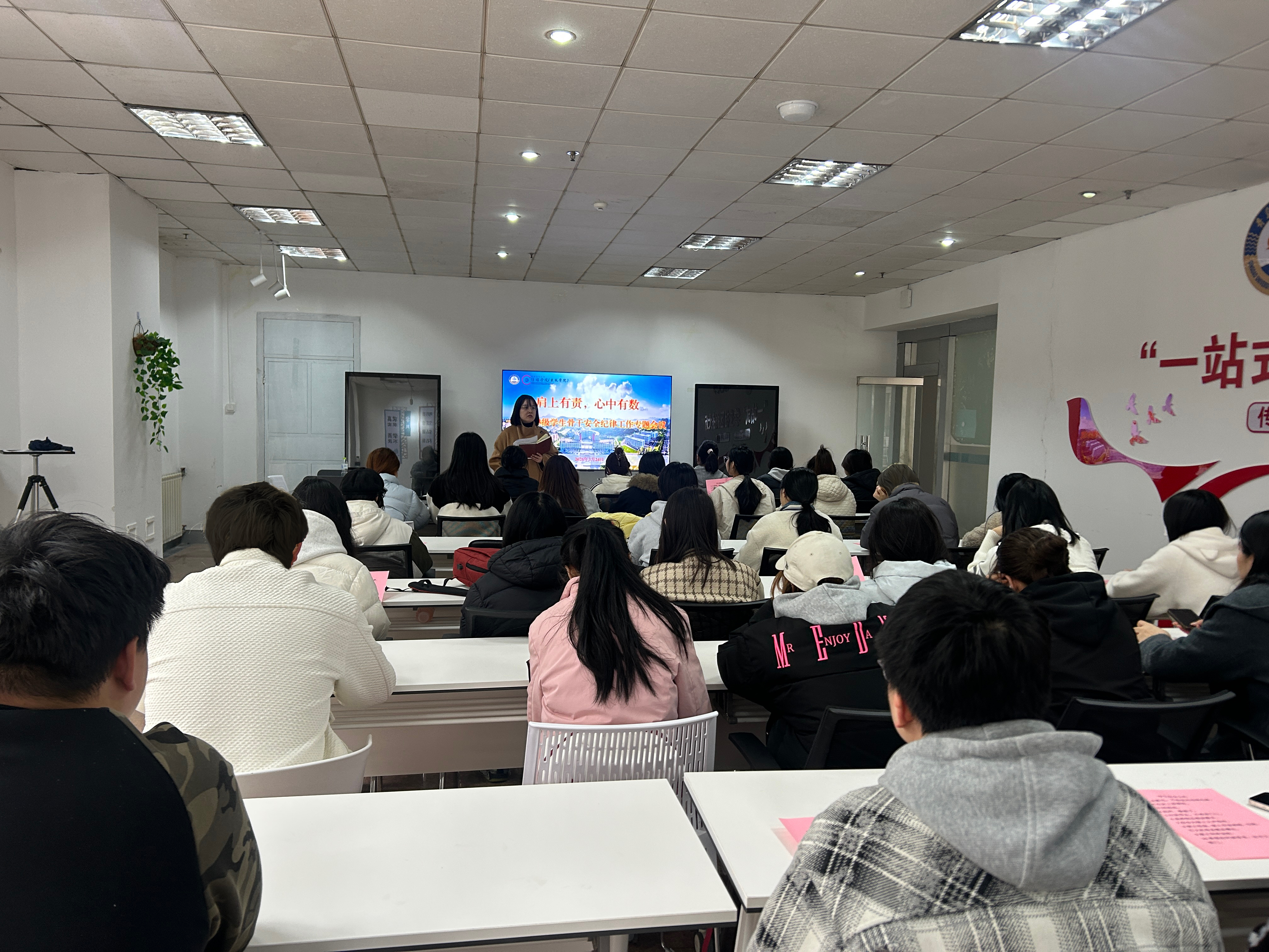 在“一站式”学生社区召开"肩上有责,心中有数”2023级本科生安全纪律专题研讨会。全体班长、团支书及宿舍长参与研讨,辅导员张鸣主持会议。